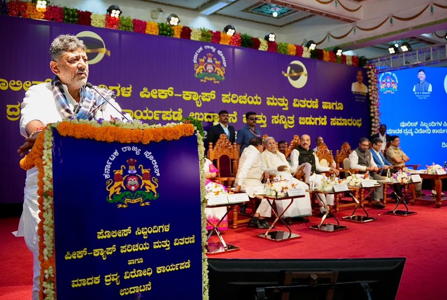 ವಿಧಾನಸೌಧದ ಬ್ಯಾಂಕ್ವೆಟ್ ಹಾಲ್ ನಲ್ಲಿ ಮಂಗಳವಾರ ಪೊಲೀಸ್ ಸಿಬ್ಬಂದಿ ಪೀಕ್ ಕ್ಯಾಪ್ ಪರಿಚಯ ಮತ್ತು ವಿತರಣೆ ಕಾರ್ಯಕ್ರಮದಲ್ಲಿ ಡಿಸಿಎಂ ಡಿ.ಕೆ. ಶಿವಕುಮಾರ್ ಅವರು ಮಾತನಾಡಿದರು.