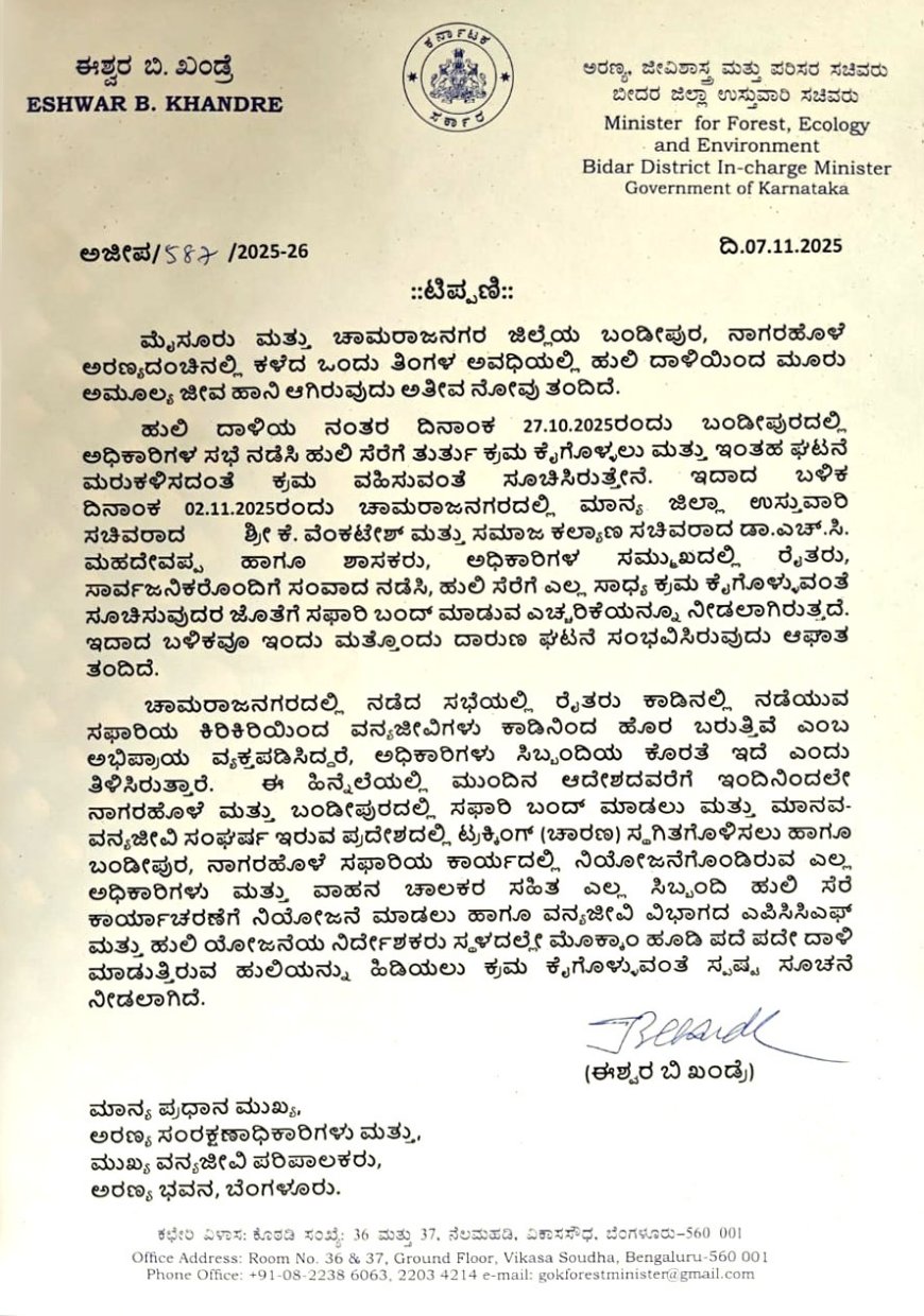 ಮೈಸೂರು ಮತ್ತು ಚಾಮರಾಜನಗರ ಜಿಲ್ಲೆಯ ಬಂಡೀಪುರ, ನಾಗರಹೊಳೆ ಅರಣ್ಯದಂಚಿನಲ್ಲಿ ಕಳೆದ ಒಂದು ತಿಂಗಳ ಅವಧಿಯಲ್ಲಿ ಹುಲಿ ದಾಳಿಯಿಂದ ಮೂರು ಅಮೂಲ್ಯ ಜೀವ ಹಾನಿ ಆಗಿರುವುದು ಅತೀವ ನೋವು ತಂದಿದೆ ಎಂದೂ ಈಶ್ವರ ಖಂಡ್ರೆ ತಿಳಿಸಿದ್ದಾರೆ.