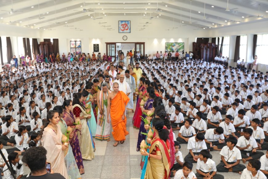 ಪ್ರಾರಂಭದಲ್ಲಿ ಶಾಲೆಯ ಶಿಕ್ಷಕೀಯರು ಸ್ವಾಮೀಜಿಗೆ ಪೂರ್ಣಕುಂಭದ ಸ್ವಾಗತವನ್ನು ಕೋರಿದರು. ಶಾಲೆಗೆ ಆಗಮಿಸಿದ ಶ್ರೀಗಳು ಶ್ರೀಕೃಷ್ಣನಿಗೆ ಪುಪ್ಪರ್ಚನೆ ಮಾಡಿದರು. ತದ ನಂತರ ವಿದ್ಯಾರ್ಥಿಗಳ ಬೆಳಗ್ಗಿನ ಪ್ರಾರ್ಥನೆಯಲ್ಲಿ ಭಾಗವಹಿಸಿದರು. ಸಂಸ್ಥೆಯ ಸಂಸ್ಥಾಪಕರಾದ ಡಾ.ಕೆ.ಸಿ. ನಾಕ್ ಮತ್ತು ಅವರ ಧರ್ಮಪತ್ನಿ, ಸಂಸ್ಥೆಯ ಟ್ರಸ್ಟಿಯಾದ ಶ್ರೀಮತಿ ಸಗುಣ ಸಿ ನಾಕ್ ಅವರು ಸ್ವಾಮೀಜಿಯವರಿಗೆ ಶಾಲು ಹೊದಿಸಿ ಫಲಪುಷ್ಪವನ್ನು ನೀಡಿದರು. ನಂತರ ಪೂಜ್ಯ ಶ್ರೀಗಳು ಸಂಸ್ಥೆಯ ಪ್ರಮುಖರಿಗೆ ಹಾಗೂ ವಿದ್ಯಾರ್ಥಿಗಳಿಗೆ ಮಂತ್ರಕ್ಷತೆಯನ್ನು ನೀಡಿ ಆಶಿರ್ವಾದಿಸಿದರು.